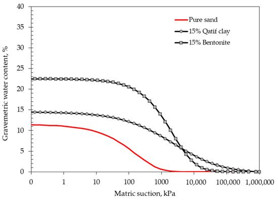 The drop in the hydraulic conductivity value (k) for samples not subjected to the freeze-thaw process was observed from 5.8 × 10−8 to 3.0 × 10−8 over the period from 100 days to 160 days for the mixture with 15% bentonite clay. In the case of freeze-thaw condition, the drop is reported from 2.8 × 10−8 to 1.2 × 10−8 (Figure 4). This can be estimated as half the k value. The drop in the hydraulic conductivity value (k) for the mixture including 20% natural Al-Qatif clay under a low surcharge of 7 kPa (Figure 5), was found within a small range of 2.5 × 10−6 to 1.5 × 10−6 in a period of 25 to 150 days. When comparing this result to the samples subjected to freeze-thaw cycles we can observe that the freeze-thaw indicates a variant effect and shows a minor (Figure 5) to major (Figure 4) change in the hydraulic conductivity trend. The freeze-thaw cycles can cause structural disturbance or disperse the clay, sealing the pores and voids within the clay. Expansive clays with significant amounts of montmorillonite and smectite minerals were found the most affected by freeze-thaw cycles. It seems that the effect of the freeze-thaw cycle is linked to the level of plasticity and rate of expansiveness. The natural clay is less expensive than the bentonite and the changes in expansion and contraction are less than that of the bentonite. This in turn could be deduced from the higher retention capacity of bentonite, soil water retention curves of used mixtures, and the base material of sand (Figure 6). These curves illustrate the retention capacity of the materials and reflect their pore size distribution and porosity, depending on texture and structure [41,42]. The higher water content values at the state of saturation (saturated water content) indicate higher total porosities and show further effects of the cracks induced due to the freeze-thaw cycles [17]. The freeze and thaw cycles can change the micro and macro pore structure and fabric, and this may affect the SWCC. The scope of study of this work did not include this work and can be presented in future studies.