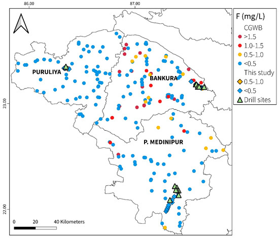 Groundwater F concentrations in the study area; circles represent data from CGWB, while diamond shapes represent samples from this study.