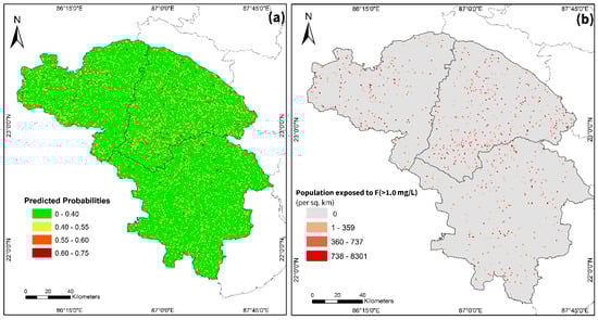 Predicted model maps, (a) probabilities of occurrence of groundwater F (>1.0 mg/L), (b) the population exposed to groundwater F above 1 mg/L.