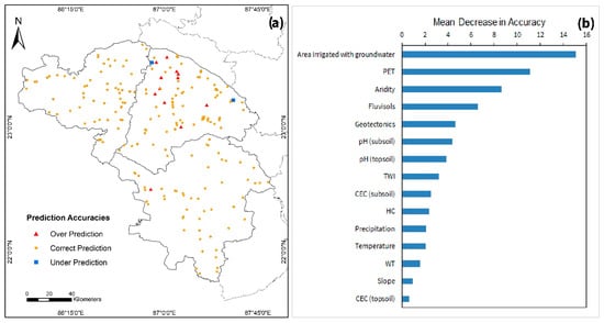 (a) Map showing the accuracies of the groundwater F prediction; (b) mean decrease in accuracy of the predictor variables: PET—Potential Evapotranspiration, TWI—Topography Wetness Index, HC—Hydraulic Conductivity, WT—Depth to Water Table, and CEC—Cation Exchange Capacity.