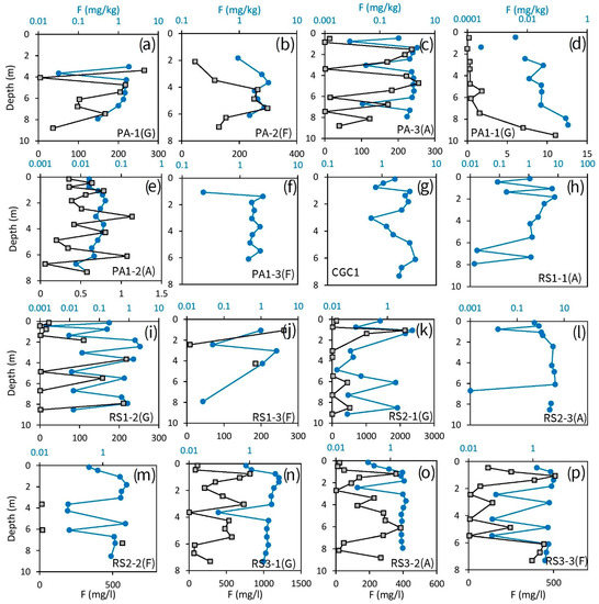 Unsaturated zone F depth profiles of the drilled sites; Blue circles and lines represent mg/kg values, whereas grey squares and black lines represent mg/L values. PA—Pleistocene Alluvium, CGC—Chotanagpur Gneissic Complex, RS—Residual Soils; letters in parenthesis indicate: G—Grasslands, A—Agricultural, and F—Forest land.