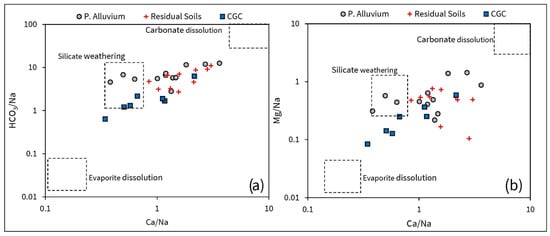 Bivariate molar ratio plots, (a) HCO3/Na vs. Ca/Na, (b) Mg/Na vs. Ca/Na.