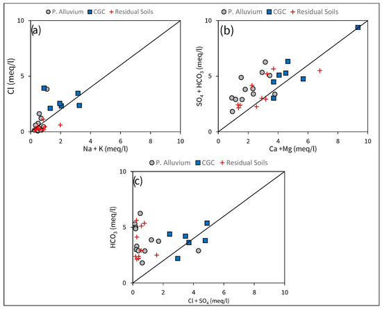 Groundwater F concentration is highest (maximum 0.6 mg/L) in Puruliya as per the groundwater samples collected, underlain by the CGC, followed by groundwater in Bankura (maximum 0.6), underlain by Pleistocene Alluviums, and groundwater in P. Medinipur (maximum 0.4), underlain by Residual Soils []. The occurrence of F in the groundwater of the study area has been attributed to the dissolution of F-bearing minerals found in the underlying rocks of the region [,]. The evolution of groundwater chemistry can be explained by tracing the origin of solutes, their dominance, and hydrogeochemical processes. Molar ratio bivariate plots such as Na-normalized Ca, Mg, and HCO3 can be used to ascertain whether solutes have been derived from the weathering of silicate rocks or the dissolution of carbonates and/or evaporites [,,]. Here, silicate weathering, along with carbonate and evaporite dissolution, is found to control the evolution of the hydrochemistry of the study area, as evident from the bivariate plots (Figure 6a,b). (Na + K)/Cl milliequivalent ratio represents cation sources; a positive value indicates silicate weathering source, while a negative value indicates evaporite dissolution [,]. Figure 7a shows that most of the groundwater falls along the 1:1 line suggesting both silicate weathering and evaporite dissolution. In the (SO4 + HCO3) vs. (Ca + Mg) plot (Figure 7b), groundwater falls along the 1:1 line and some above it, which indicates the sources of Ca, and Mg to be dominantly silicate weathering [,]. The HCO3 vs. (Cl + SO4) plot (Figure 7c) shows that groundwater from Residual Soils terrain and Pleistocene Alluvium have dominance of carbonate dissolution over evaporite dissolution as the samples plot above the 1:1 line. In contrast, samples from CGC plots along the 1:1 line suggest both evaporite and carbonate dissolution []