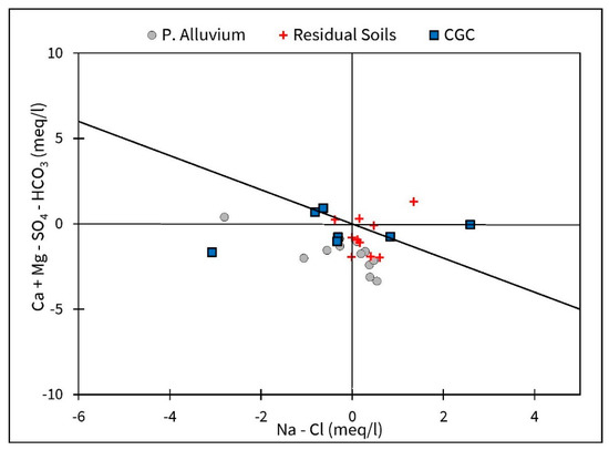 Ca + Mg − SO4 − HCO3 vs. Na − Cl plot.