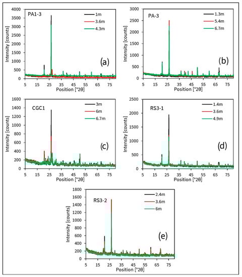XRD peaks of the sediments from different boreholes at different depths beneath (a,b)—Pleistocene alluviums; (c)—Chotanagpur Gneissic complex; (d,e)—residual soils.