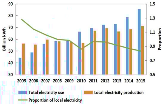 Local electricity generation and its proportion to total electricity use in Shenzhen during 2005–2015.