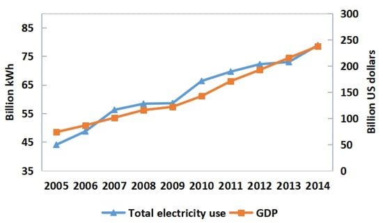 Relationship between GDP and total electricity use in Shenzhen during 2005–2014.