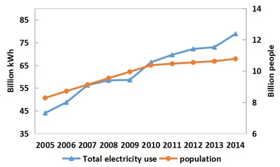 Relationship between population and total electricity use in Shenzhen during 2005–2014.