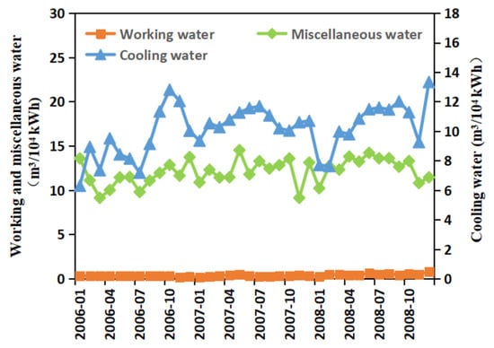The Yueliangwan power plant used heavy oil and adopted tap water in a closed-cycle circulating water system. As shown in Figure 6, its mean annual water consumption intensity for 2006–2008 was 23 m3/104 kWh, of which cooling water consumption was 10.5 m3/104 kWh, working water consumption was 0.38 m3/104 kWh, and miscellaneous water consumption was 12.12 m3/104 kWh. As the cooling water is recycled in the closed cooling system, cooling water consumption only accounted for about 45.7% of the total water consumption, which was lower than the consumption of miscellaneous water (52.7%). The monthly consumption of the working water and miscellaneous water showed small variations, while the cooling consumption varied seasonally, with a relatively small consumption occurring from January to March, which may be attributed to the low temperature of tap water in winter.