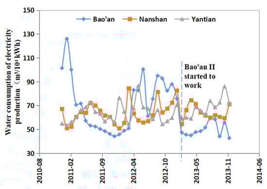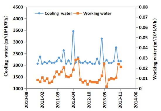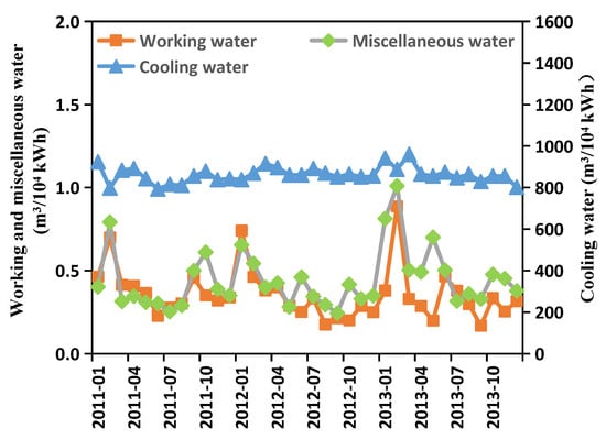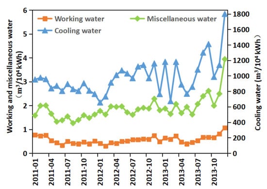 The Mawan power plant is a coal-fired power generation plant with an open cooling system, which uses seawater as its cooling water. As shown in Figure 7, its average water consumption intensity in 2011–2013 was about 993 m3/104 kWh. Its consumption of cooling water, working water and miscellaneous water was 990.1, 0.54, and 1.89 m3/104 kWh, respectively. In such an open cooling system, the cooling water cannot be recycled, and therefore almost all the water consumption was used as cooling water (99.7%). Compared to the Yueliangwan power plant, which used a closed-cycle circulating water system, the Mawan power plant consumed dozens of times the amount of cooling water and total water consumption per unit of power generation.