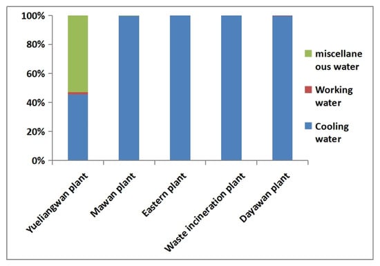 Electricity generation consumes a large amount of water and the cooling process was the main water consumption sector of the power plants studied. Except for the Yueliangwan oil-fired power plant, which had been shut down, the cooling water accounted for more than 99% of the total water consumption (Table 2 and Table 3 and Figure 11). The Yueliangwan oil-fired power plant, using a closed cooling system, had a total annual electricity generation of about 1.024 billion kWh, and consumed a total of 2.356 million m3 of tap water every year, which is equivalent to the annual water supply of a small or medium-sized reservoir, and about half of the daily water supply of all waterworks in Shenzhen. Similarly, the biomass power plants, using a closed cooling system, had an annual total electricity generation of about 1.16 billion kWh and total annual consumption of water resources of about 7.331 million m3, which is equivalent to the annual water supply of a large reservoir, and the total water supply of all waterworks in Shenzhen for more than a day and a half (Table 2).
