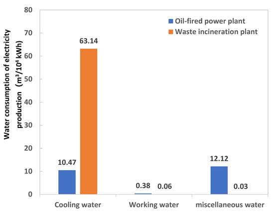 The water consumption intensity was generally affected by the fuel types and the cooling methods of the power plants. For example, although both the Yueliangwan power plant and the biomass plants adopted a closed cooling system, their water consumption intensities all differed (Figure 12). The water consumption intensity of the former oil-fired power plant was 2.75 times that of the latter waste-to-energy plant and six times larger with regard to the cooling water. For the plants with an open cooling system, the water consumption intensity of the Mawan oil-fired power plant was about 15% larger than that of the Shenzhen Eastern power plant using natural gas. The Dayawan nuclear power plant had the largest water consumption intensity, which was 2.64 times that of the oil power plant and 2.31 times that of the gas power plant (Figure 13). Therefore, the water consumption intensity varied significantly depending on the fuel types for power generation used.
