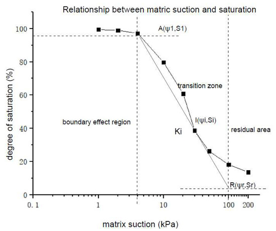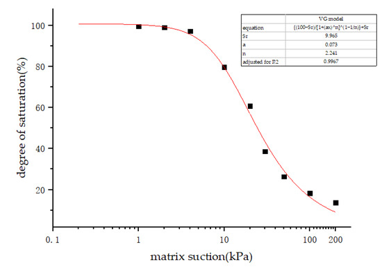 In the process of sample desaturation, the corresponding drying path soil–water characteristics curve can be obtained as shown in Figure 5 according to the corresponding degree of saturation and matric suction.