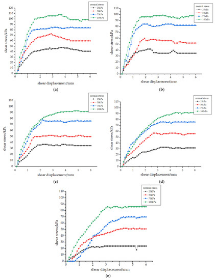 The relationship between shear stress and shear displacement under different moisture contents. (a) Moisture content 5.30% (degree of saturation 20%); (b) Moisture content 10.60% (degree of saturation 40%); (c) Moisture content 15.85% (degree of saturation 60%); (d) Moisture content 21.10% (degree of saturation 80%); and (e) Moisture content 37.86% (degree of saturation 100%).