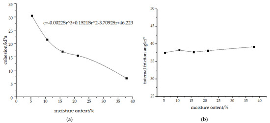 With the increase in moisture content, the rate of cohesion decreased from fast to slow and then increased to fast, presenting an S-shaped curve (Figure 8a) which was possibly due to the variability of the experimental data. Through regression analysis of cohesion and moisture content, the quantitative relationship in Equation (6) can be obtained: