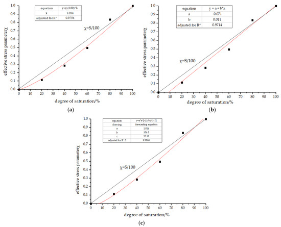 where χ is the effective stress parameter, S is degree of saturation, 0 ≤ χ ≤ 1. When the degree of saturation is S = 100%, χ = 1.When the degree of saturation is S = 0, χ = 0. a, b and c are the fitting parameters, where a is the regulating coefficient while b and c are the influencing coefficients of saturation degree on the effective stress parameters.