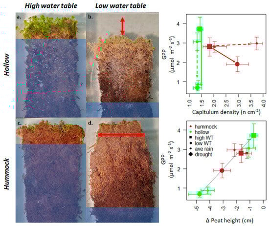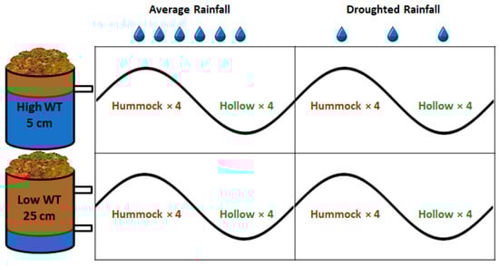 - Potvin, L.R.; Kane, E.S.; Chimner, R.A.; Kolka, R.K.; Lilleskov, E.A. Effects of Water Table Position and Plant Functional Group on Plant Community, Aboveground Production, and Peat Properties in a Peatland Mesocosm Experiment (PEATcosm). Plant Soil 2015, 387, 277–294. [Google Scholar] [CrossRef]