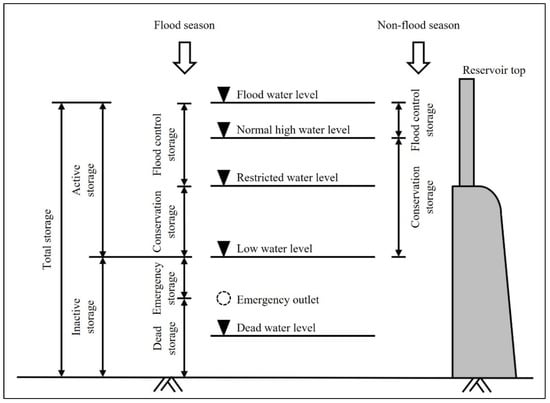 The multipurpose reservoirs in South Korea have emergency storage between the low and energy outlet levels (Figure 2). The purpose of emergency storage is to supply water during unusual or emergency conditions. The storage of a multipurpose reservoir is categorized into active and inactive storage. The active storage is categorized into conservation storage (for water supply) and flood control storage (for flood control). Conservation storage is storing water in the rainy season and using it for downstream water demand. Flood control storage is storage between the flood water level and the normal high water level in the non-flood season and between the flood water level and restricted water level in the flood season. Inactive storage refers to a reservoir water capacity below the low water level. Inactive storage divides into emergency storage and dead storage based on the emergency outlet level. The water in emergency storage is unavailable for water supply during the normal seasons. However, the water in the emergency storage (above the emergency outlet) becomes available for emergency water use and supplies water only during emergency events (e.g., extreme drought). The dead storage is storage in a reservoir that cannot be drained by gravity through the reservoir’s outlet works. Withdrawing water from the dead storage requires separate facilities to pump out the water. The water in the dead storage is unavailable for use under normal circumstances.