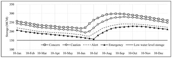 Case 1 is the default (no action) that does not consider Standard and emergency storage. In Case 1, when the reservoir water level falls between the low and high-water level, the reservoir can supply the scheduled domestic, industrial, irrigation, and instream flow. We consider a failure when the reservoir water level reaches a low water level and cannot meet the scheduled water demand.