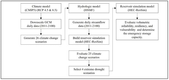 We build and run the reservoir operation simulation model to select the extreme drought scenarios from 25 climate change scenarios. Some o well-known reservoir simulation models are HEC-ResSim [40], River and Reservoir Operations [41], Modified SIMYLD [42], Corps Water Management System [43] and Water Evaluation and Planning system [44]. These reservoir simulation models are fundamentally similar, but they are different in computing algorithms, organizing structure, applying user interface, and managing data mechanism [45]. We choose HEC-ResSim 3.3 software as it is specifically designed for simulating reservoir operation that resembles the actual reservoir operation. The US Army Corps of Engineers developed this software, which has been widely used for simulating the reservoir operation worldwide [46] and in South Korea. Studies used this software to simulate reservoir operation in dry [47] and flood seasons [48]. The main input data are aerial map, channel data, evaporation data, gage data, hydraulic structure outflow data, reservoir storage, and inflow data [49]. The time-step of reservoir simulation period is set to be five days as the South Korea Water Plan uses five day period to analyze the national water budget [50].
