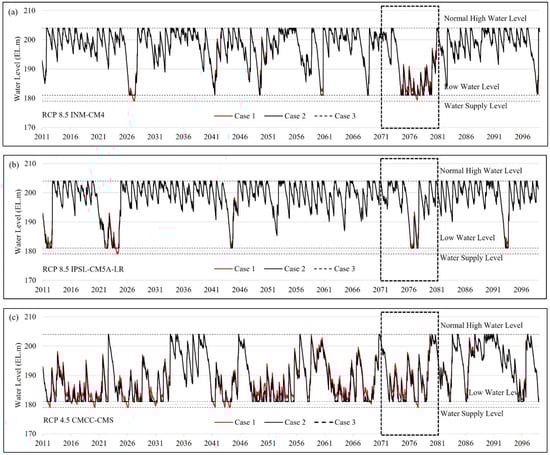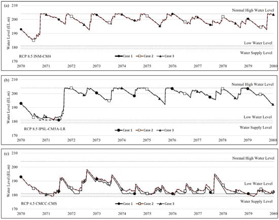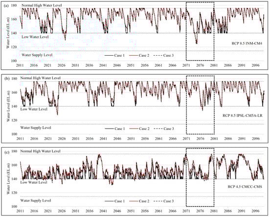 Figure 5 and Figure 6 compare Hapcehon and Gunwi reservoirs’ water levels for Cases 1, 2, and 3 in three climate change scenarios from 2011 to 2100 (90 years). These three climate change scenarios are RCP 8.5 INM-CM4 (a), RCP 8.5 IPSL-CM5A-LR (b), and RCP 4.5 CMCC-CMS (c). In Hapcheon and Gunwi reservoirs, the average low water level in Case 1 was always lower than the average low water levels in Cases 2 and 3 because Case 1 always released more water than Cases 2 and 3 (Table 6). Case 1 neglected the Standard and supplied the scheduled release requirements. Cases 2 and 3 considered the Standard that reduces the scheduled water supply depending on the current reservoir water level and utilizes emergency storage. For these two reservoirs, the average low water level in Case 3 was either the same or lower than in Case 2 because it reduced 20% of the water supply for the domestic and industrial sectors. In comparison, Case 3 provided 100% water supply for these two sectors. We found no particular pattern of changes from 2011 to 2100.