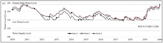 As Figure 5 and Figure 6 cover 90 years of water level fluctuation for all three cases, it is challenging to distinguish the characteristics of these three cases. Thus, we determined and extracted the extreme drought period (from 2070 to 2080) and graphed them separately in Figure 7a–c and Figure 8a–c. In Figure 7a the water level does not drop below low water level in Case 1 because Case 1 does not use the emergency storage, which is below the low water level. The water level in Cases 2 and 3 goes below the low water level because these two scenarios activate emergency storage during the severe drought. Except for this severe drought period, the water level in Case 2 was either the same or higher than in Case 3. The water level in Case 3 was the same or higher than the water level in Case 1 because Case 2 applied Standard and activated the emergency storage, and on top of these two, Case 3 did not reduce the domestic and industrial water supply.