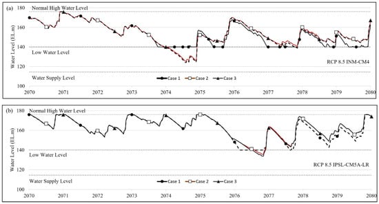 Figure 5 and Figure 6 compare Hapcehon and Gunwi reservoirs’ water levels for Cases 1, 2, and 3 in three climate change scenarios from 2011 to 2100 (90 years). These three climate change scenarios are RCP 8.5 INM-CM4 (a), RCP 8.5 IPSL-CM5A-LR (b), and RCP 4.5 CMCC-CMS (c). In Hapcheon and Gunwi reservoirs, the average low water level in Case 1 was always lower than the average low water levels in Cases 2 and 3 because Case 1 always released more water than Cases 2 and 3 (Table 6). Case 1 neglected the Standard and supplied the scheduled release requirements. Cases 2 and 3 considered the Standard that reduces the scheduled water supply depending on the current reservoir water level and utilizes emergency storage. For these two reservoirs, the average low water level in Case 3 was either the same or lower than in Case 2 because it reduced 20% of the water supply for the domestic and industrial sectors. In comparison, Case 3 provided 100% water supply for these two sectors. We found no particular pattern of changes from 2011 to 2100.