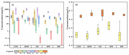 The variation in the hydrochemical parameters of the river water samples is large but regular, indicating the mixing of river water from other sources. Along the flowing direction from R04 to R05 (Figure 1c), the water temperature gradually increases, and the concentration of B also increases significantly. This is consistent with the results of the influence of groundwater containing arsenic, fluorine, and boron on drinking water in Argentina studied by Hudson-Edwards et al. [45].