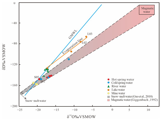 Surface water and groundwater are commonly distributed near the Global Meteoric Water Line (GMWL), with meteoric water as the recharge source [47]. The isotope data representing ice–snow meltwater collected from the Nyenqing–Tanggula Mountain at an altitude of approximately 5500 m are also shown in Figure 3. [43], and magmatic water with δD of 20‰ ± 10‰ and δ18O of 10‰ ± 2‰ from Giggenbach [44]. All of the hot spring samples were distributed within the mixing area of ice–snow melting water and magma water, indicating that they were recharge sources of geothermal water. The δ18O and δD values of S05 and S02 are lower and closer to GMWL, and the other spring water samples have higher values, indicating that S05 and S02 are supplied by a greater proportion of meteoric water, whereas other springs have experienced greater deep source mixing during migration [48]. According to Figure 3, ice melting and local meteoric waters are the recharge source of river water and mine water. The high δ18O and δD values of water collected from the lake, especially L02 and L03, indicate that the lake water occurred with strong evaporation and formed an evaporation line with R2 = 0.9913.