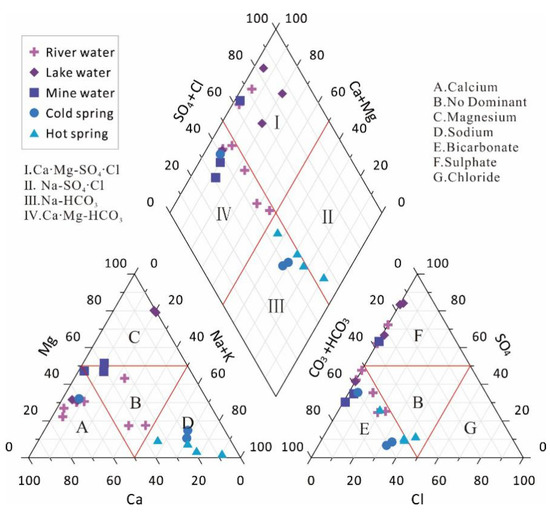 The hot spring water samples fall in region D of the cationic triangle on the left, indicating that the cations are dominated by Na+. The lake and river water samples fall in zones A and B, suggesting that the cations in the surface water are mainly nondominant and calcium types. It can be seen that HCO3− is the main anion, and the lake water was dominated by sulfuric acid type, which could be affected by evaporation.