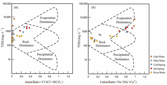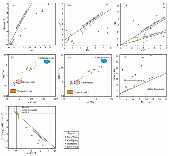 The Na+-Cl− diagram that cold spring, mine water, and surface water are all located under the curve of y = x (Figure 8a), and halite dissolution can be excluded. The Cl in groundwater generally comes from weathering, the leaching of rocks or sediments, or volatilization from deep magma. The hot springs have offset the curve of y = x (Figure 8a), indicating volatiles from deep magma [55]. The extra Na+ in cold water is most likely the result of silicate weathering and/or cation exchange processes.