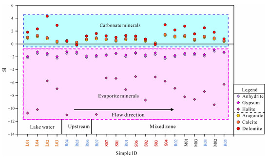 For carbonate minerals, the analysis results of all water samples show a supersaturated state (SI > 0) and show a certain regularity. Along the flow direction of the river water, different types of groundwater discharge into the river water. The SI value of river water relative to carbonate minerals gradually increased, indicating that its saturation state gradually increased, which also shows that the impact of groundwater discharge cannot be ignored.