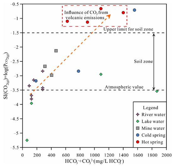 Figure 7 shows the relationship between HCO3− + CO32− and the logarithm of partial pressure of CO2 (g) (log (pCO2 (g))) for the groundwater samples. Most surface water and groundwater fall within the soil (pCO2 (g) = 10−1.5 atm) and atmospheric (pCO2 (g) = 10−3.5 atm) CO2 (g) range. Surface water is very close to equilibrium with atmospheric CO2 (g), indicating the fastest recharging waters [52]. The hot spring samples are in equilibrium with values above the upper limit of CO2 (g) in the soil region (pCO2 (g) = 10−1.5 atm), indicating that they are influenced by volcanic emissions of CO2 (g). Their pCO2 (g) values ranged from 10−1.13 to 10−0.66 atm.