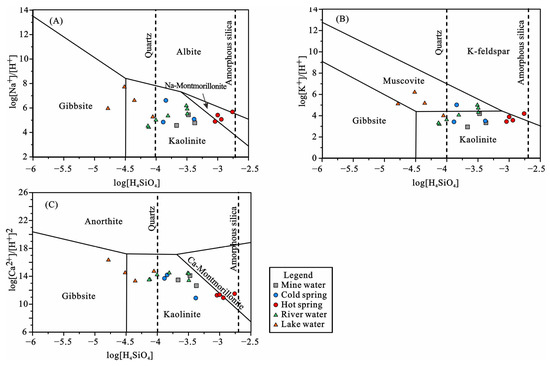It can be seen from Figure 9 that the water samples in the study area are in a state of dissolution with respect to feldspar. The weathering process of albite in groundwater and surface water has passed from the gibbsite stage to the kaolinite stage, and the hot spring water samples have reached the stage of Na-montmorillonite (Figure 9A). The K-feldspar has not yet reached saturation and is in a state of dissolution, and the weathering has reached the kaolinite stage (Figure 9B). Weathering of anorthite is also at the kaolinite stage (Figure 9C).