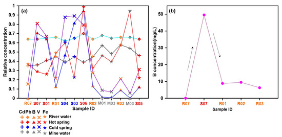 (a) The covariant relationship of Cd, Pb, B, V and Fe along the river direction; (b) Variations of B concentrations of Langmai River waters along the flow direction.