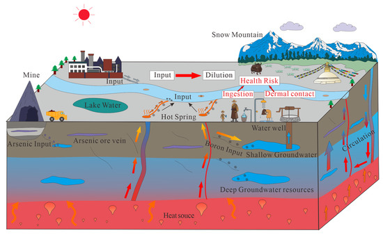 The Qinghai–Tibet Plateau is well known as the “Asian Water Tower” (AWT) and is the source of the Yarlung Zangbo (Brahmaputra), Indus, Ganges, Mekong, Yangtze, and Yellow rivers. Its water environment is essential to the security of drinking water for nearly 1.4 billion people in more than a dozen countries in Asia [1]. In addition, the Qinghai–Tibet Plateau is an important part of the Mediterranean–Himalayan Geothermal Belt, with lots of geothermal systems and numerous surface thermal manifestations [2,3,4,5,6,7]. Additionally, under the trend of energy transformation, geothermal energy as clean energy will undoubtedly usher in prosperity, but some potential water security risks cannot be ignored [8]. Compared with other types of natural water bodies (such as shallow groundwater and surface water), geothermal water with higher temperatures can usually leach more chemical components from its host medium. The typical harmful components include CO2 and H2S, as well as mercury, arsenic, fluorine, lead, chromium, boron, and radon [9]. Sources of these toxic elements are related to hydrochemical processes such as water–rock interaction, mixing, and degassing [10,11]. Under the influence of various geological or human factors, such as hot spring water discharge and geothermal water recharge, geothermal water is discharged into shallow aquifers, surface water, and the surrounding environment, bringing hidden dangers to the safety of surrounding drinking water [12,13]. Additionally, the rich geothermal resources in the Qinghai–Tibet Plateau will be accelerated exploitation driven by the long-term goal of carbon neutrality [14]. Therefore, the security of the water environment in the AWT and the assessment of potential health risks have become more significant as the anthropogenic accelerate the discharge of harmful components from geothermal water.