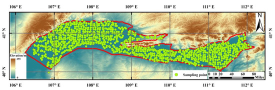 The Hetao Plain is located in the central and western regions of the Inner Mongolia Autonomous Region (106°07′~112°15′ N and 40°10′~41°27′ E), north of the Great Wall and south of the Yinshan Mountains, from Helan Mountain in the west and east to Hohhot in the east (Figure 1). The Hetao Plain is formed by the alluvium of the Yellow River, and some of its tributaries, extending from east to west along the Yellow River, with a length of about 591.6 km, a width of 20–90 km from north to south, and an area of 23,575 km2, are fanned out in an arc. The elevation of the study area is high in the west and low in the east. The Hetao Plain is located in an arid and semi-arid region. It is hot and humid in the summer, rainy and hot in the same period, and cold and dry in the winter with a large temperature difference between the day and night. Due to a large amount of evaporation and lack of precipitation, the agricultural water consumption in the Hetao Plain mainly comes from the Yellow River and groundwater, which is a typical irrigated agricultural region.
