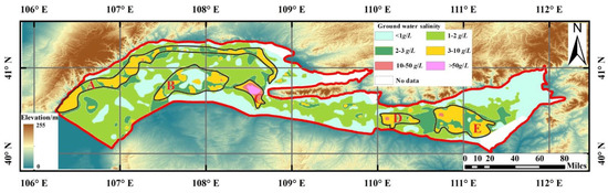 Highly mineralized water, also known as mineralized water, refers to water with a salinity greater than 3000 mg/L [1]. The unscientific mining and use of highly mineralized water will cause certain damage to the local ecological environment, such as the increase in salinity of river water, the raising of shallow groundwater level, the growth of salinization in the soil, the intolerance of saline-alkali weakened forest tree vigor, and reduction in crop production [2,3]. Therefore, it is essential not only to obtain the spatial distribution of highly mineralized groundwater, but also to investigate the formation mechanisms, so as to improve the health and living standards of local residents.