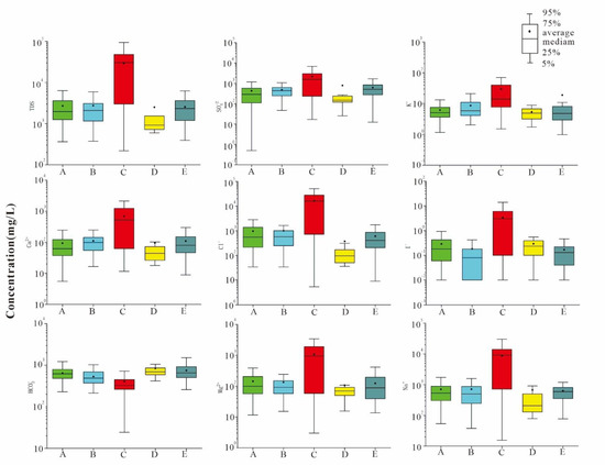 Box plot of TDS and the main ion concentrations in the five zones according to the map in Figure 3.