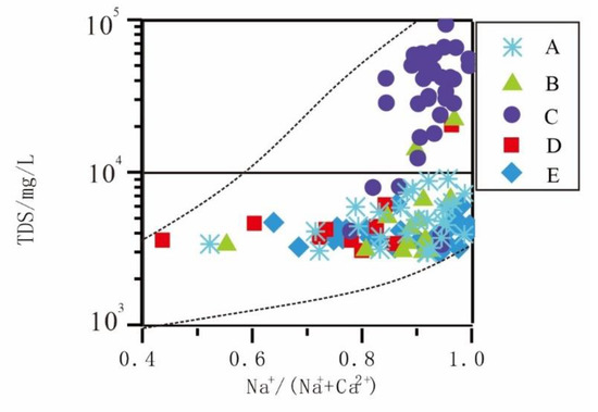 The γ(Na+)/γ(Cl−) coefficient is a hydrogeochemical parameter that characterizes the enrichment degree of sodium ions in groundwater. The average γ(Na+)/γ(Cl−) coefficient of standard seawater is 0.85. Continental freshwater has a higher γ(Na+)/γ(Cl−) coefficient γ(Na+)/γ(Cl−) > 0.85, while oceanic seawater has a lower γ(Na+)/γ(Cl−) coefficient γ(Na+)/γ(Cl−) < 0.85 [31].