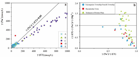 The γ(Na+)/γ(Cl−) scale coefficient (a) and relationship between γ(Na+)/γ(Cl−) and (γ(Cl−)-γ(Na+))/γ(Mg2+) diagram (b) of shallow groundwater in Hetao Plain.