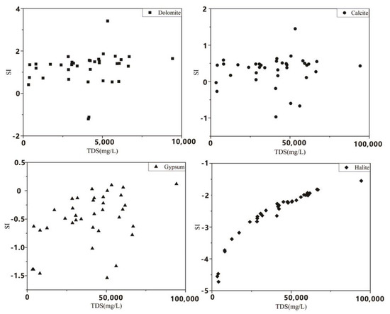 We calculated the SI of groundwater in area C, where the groundwater salinity is highest. According to the calculation, the obtained SI vs. TDS dependences is shown in Figure 8. The SI variation range of dolomite, calcite, gypsum and halite is, respectively: −1.2~3.4, −9.7~1.45, −1.54~0.12, −4.72~−1.55. Gypsum and halite SI < 0, and the aquifer sediments in this area are rich in rock salt and gypsum, so the contribution of these two minerals in groundwater ions is absolutely dominant. The SI of calcite and dolomite is mostly positive and close to 0, indicating that these two minerals are most likely present in the aquifer environment and control the chemical composition of the groundwater.