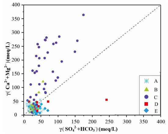 Relationship between γ (Ca2+ + Mg2+) and γ (SO42− + HCO3−) in shallow groundwater of Hetao Plain.