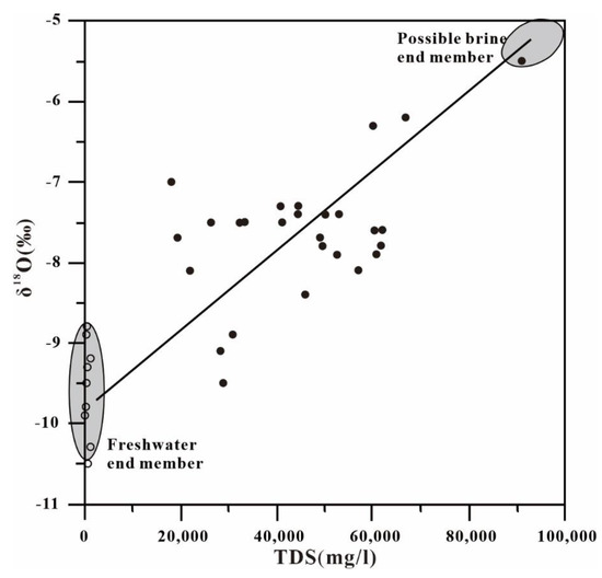 The δ18O-TDS relationship is usually used to identify evaporation, salt dissolution, and salt water mixing. Generally, the δ18O value of groundwater salinity caused by evaporation varies greatly, while the salinity degree varies little. The sample points are distributed along the δ18O axis, with a slight shift [36]. The solid points in the figure represent groundwater samples with salinity are greater than 20 g/L, and the hollow points represent brassy water and fresh water samples with salinity are less than 2 g/L. The variation of δ18O in salinity caused by groundwater dissolved salts is small, and the sample points are distributed along the TDS axis. The δ18O value of salt water diluted by fresh water will increase with the increase in salinity. Figure 10 shows the δ18O-TDS relationship of samples with different salinity in the distribution area of high salinity water in Xishanzui. It can be seen that the highly mineralized samples are roughly distributed along a straight line between fresh water and brine 27 sample with the highest salinity (90 g/L), indicating that the shallow highly mineralized groundwater has experienced the influence of freshwater mixing dilution.
