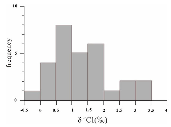 The chlorine isotope standard was standard sea water, and the δ37Cl value was 0, compared with 0.0 ± 0.01‰ in modern sea water. The range of δ37Cl in atmospheric solutions is known to be +0.42‰~2.53‰. The δ37Cl of river water is higher with the range from +0.74‰ to +2.85‰, while the δ37Cl of salt lake brine is lower and with the range from −2.06‰ to +1.01‰. Theδ37Cl of groundwater varies from −0.50‰ to +0.69‰, and the δ37Cl of rock salt varies from −0.6‰ to +1.2‰ [37].