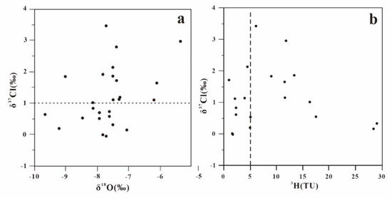 δ37Cl-δ18O (a) and δ37Cl-3H (b) value relationship of subsurface brine in Xishanzui.