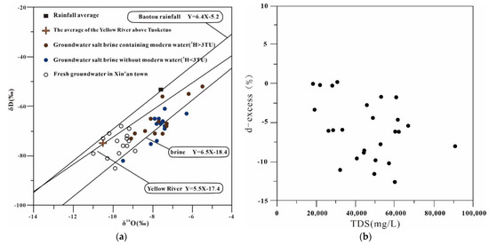 (a) Hydrogen and oxygen stable isotope composition of subsurface brine in Xishanzui; (b) Relationship between deuterium excess and TDS of highly mineralized groundwater samples in Xishanzui.