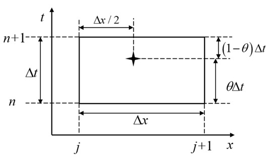 The Saint-Venant equations are first-order linear hyperbolic partial differential equations, and the analytical solution of the equation cannot be obtained accurately through calculation. In this research, the Preissmann four-point method (Figure 1) with a fast convergence speed is used for discretization, and a grid equation system is established [20]. Combined with the upstream and downstream boundary conditions, a closed non-linear equation system is obtained, and the chase method is used to solve the system. The hydraulic structures inside the canal pool, such as the gate, the water outlet, and the inverted siphon, are generalized according to the inner boundary. For details, please refer to the research results of Kong Linzhong et al. [21].