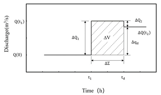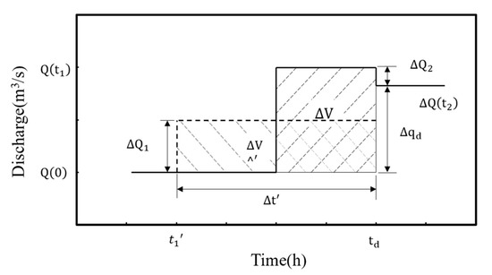The principle of the storage compensation algorithm for a channel with a single canal pool and a single water outlet is shown (Figure 4). It is assumed that the diversion head suddenly changes by at the downstream moment , and the corresponding channel storage volume changes by at the same time, as shown in the shaded part of Figure 4. To keep the water level in the canal pool stable, it is necessary to increase the upstream inflow by at time in advance. In the figure, is the propagation time of the disturbance wave (delay time). Finally, in order to balance the inflow and outflow, it is necessary to reduce the inflow by at .
