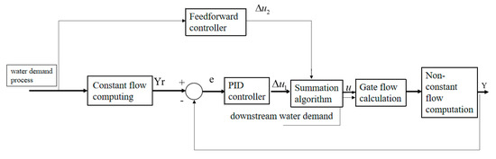 The non-linear PID control algorithm is a closed-loop system that can ensure the stability of the system. However, sometimes, the fast response of the system is poor and there are oscillations; so, when the water consumption plan or water consumption flow is known, the feed-forward link is added in advance to enhance the fast response of the system. For constant water level operation in the downstream area, it is necessary to analyze and design the corresponding controller for the variation of the reservoir storage [31].